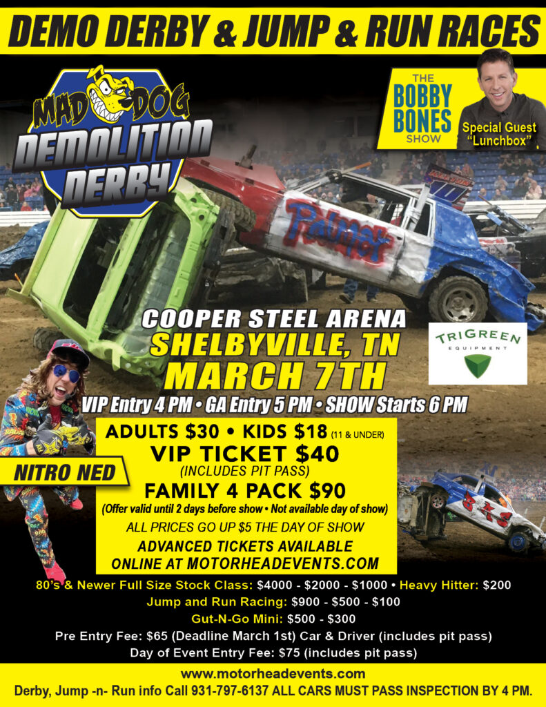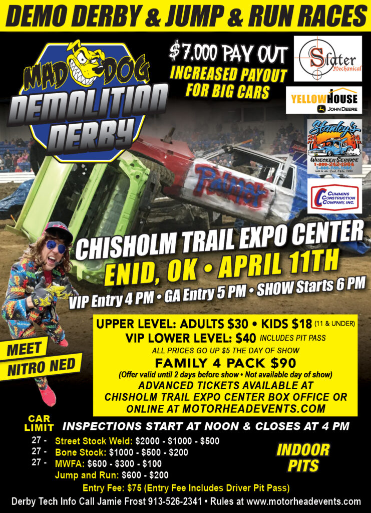 – Sandbagging is not tolerated and will be strictly enforced. Locking up the brakes prior to a hit for anything other than a driver’s door will be a cause for disqualification. The fans pay to see a show, put one on for them!